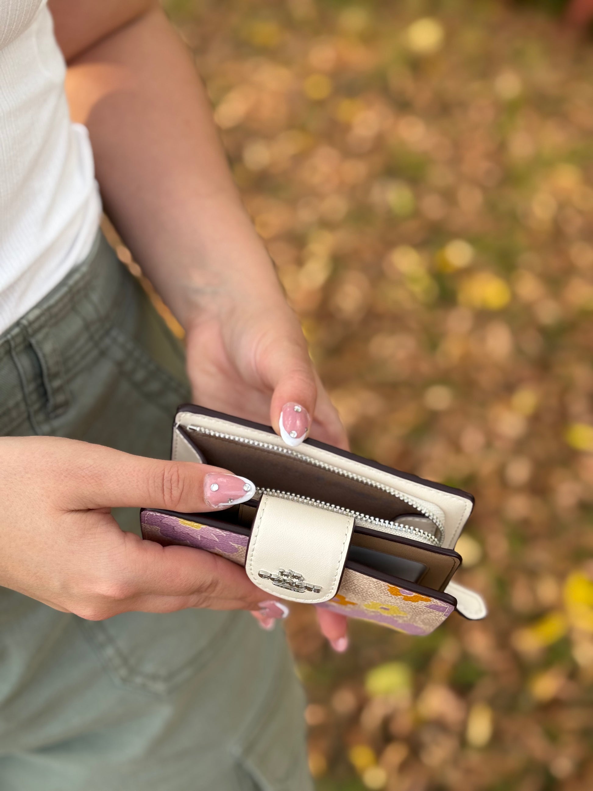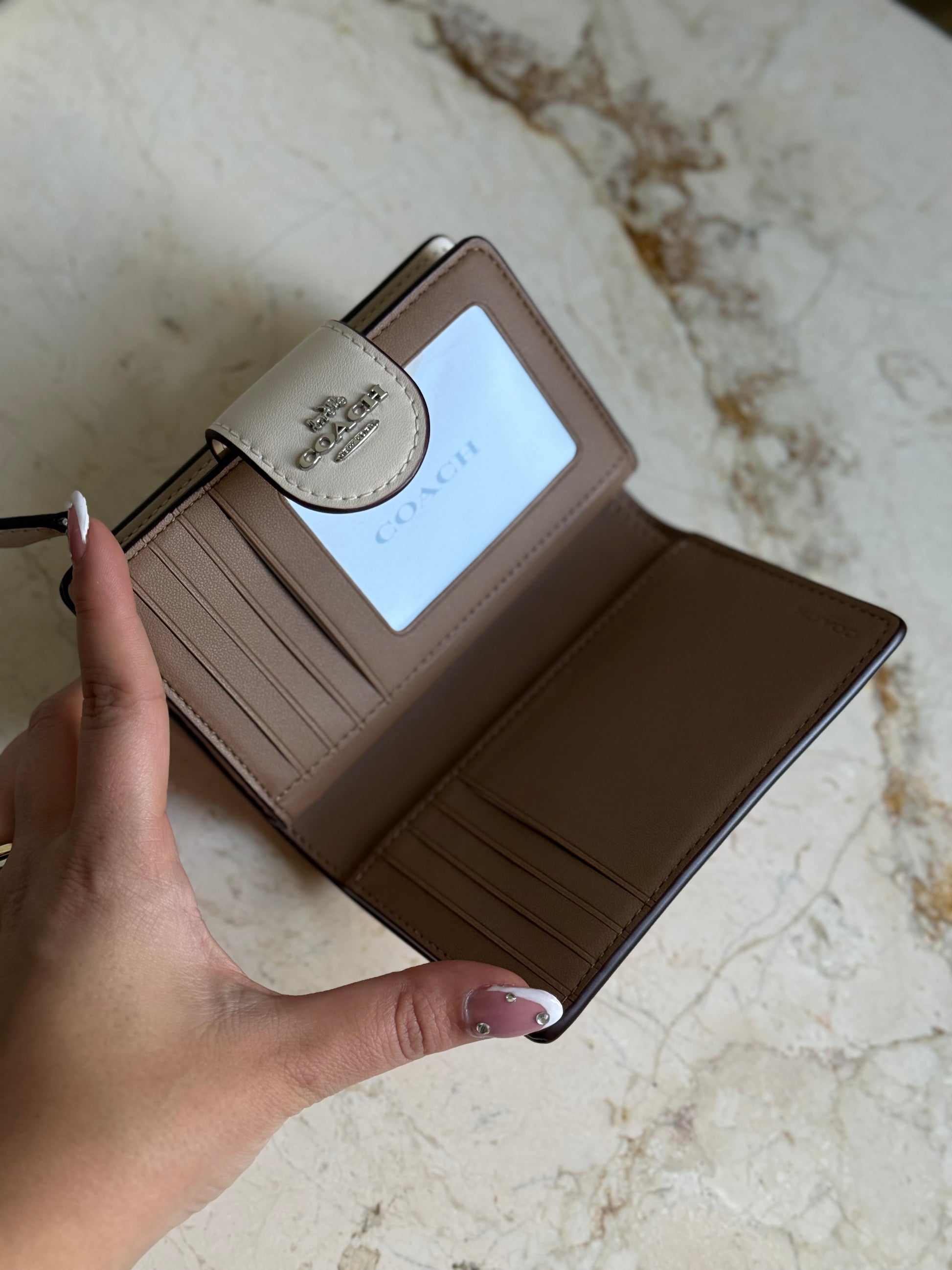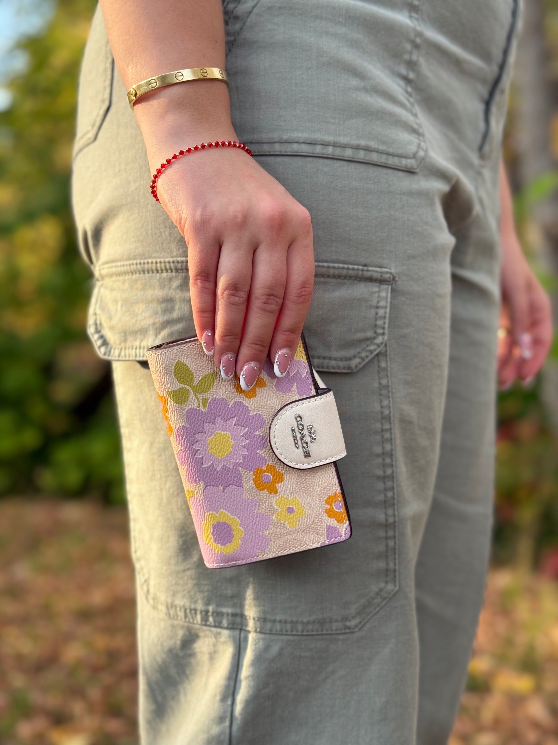 Hermosa billetera floreada de Coach, junto a la combinación perfecta de los logos monogram que caracterizan a la marca. Tiene 8 inserciones para tarjetas de crédito y una cierre para monedero.